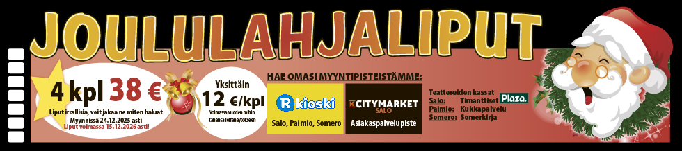 Muista Bio Salon Leffapassi –alennusta lipuista. Voit ostaa elokuvalippuja ja/tai makeiskortteja myös lahjaksi. Kysy lisää!